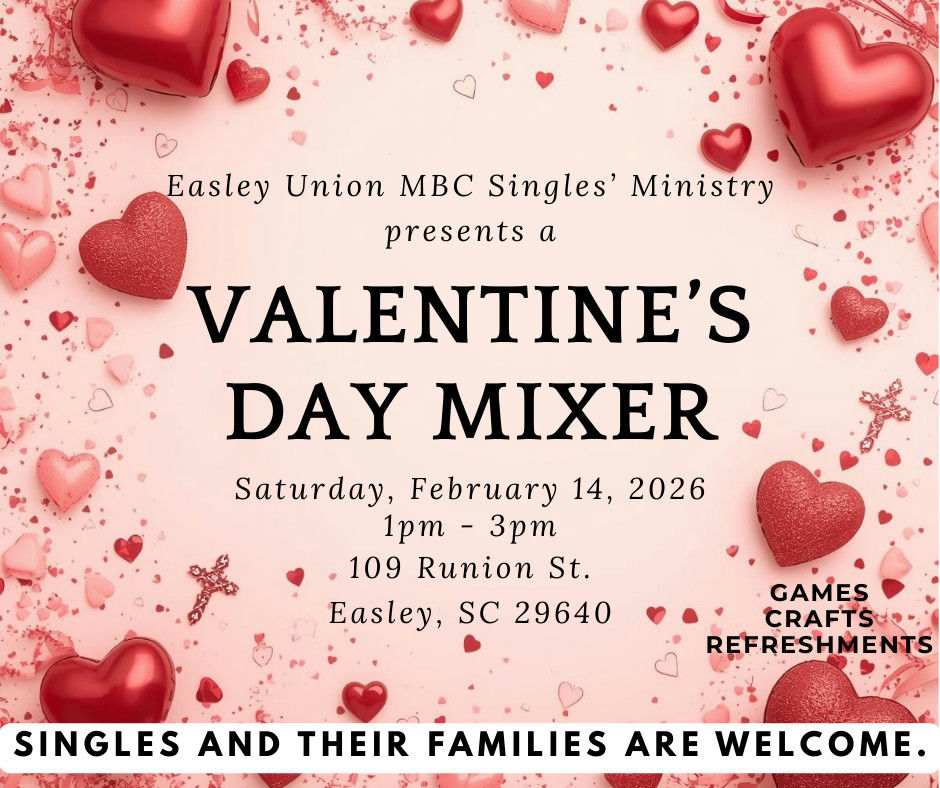 Easley Union Missionary Church Singles' Ministry is hosting mixer where singles individuals, and their children, can come and have fun, play games, fellowship, and have light refreshments.
