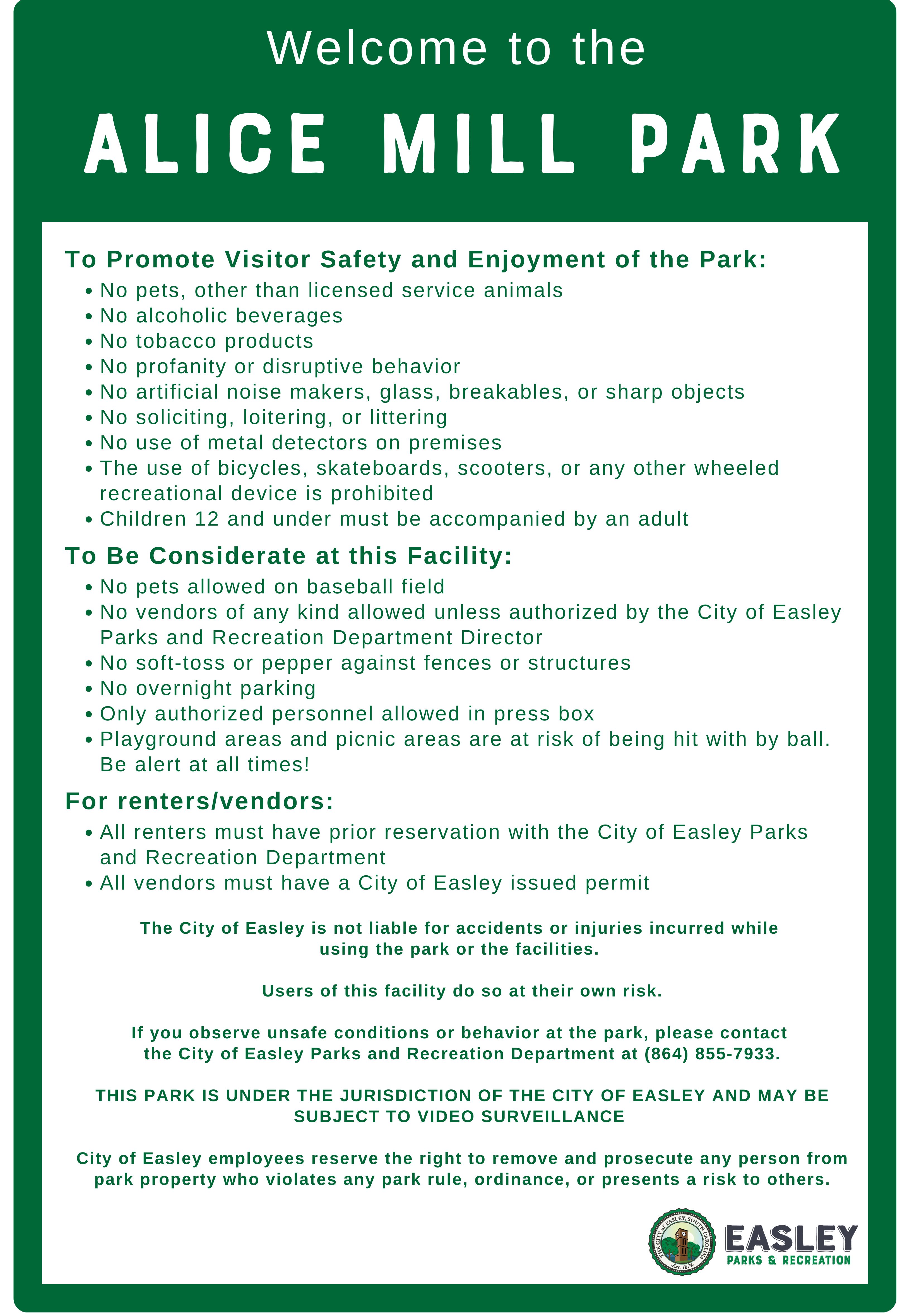 Alice Mill Park is the host of our legion baseball field. This is a popular ball park for our high school age baseball players and tournaments such as The Senior League World Series and The National Christian College World Series.
