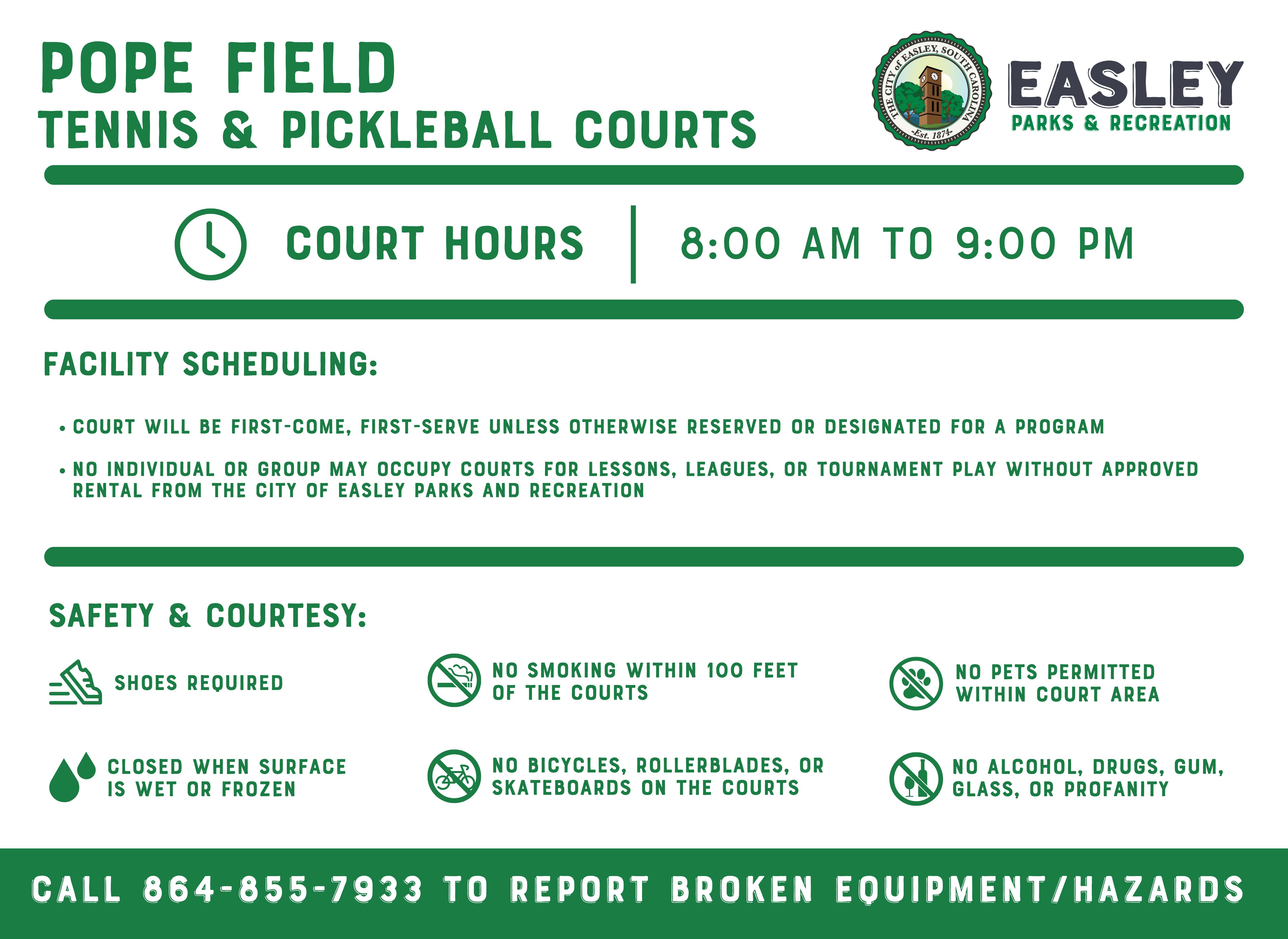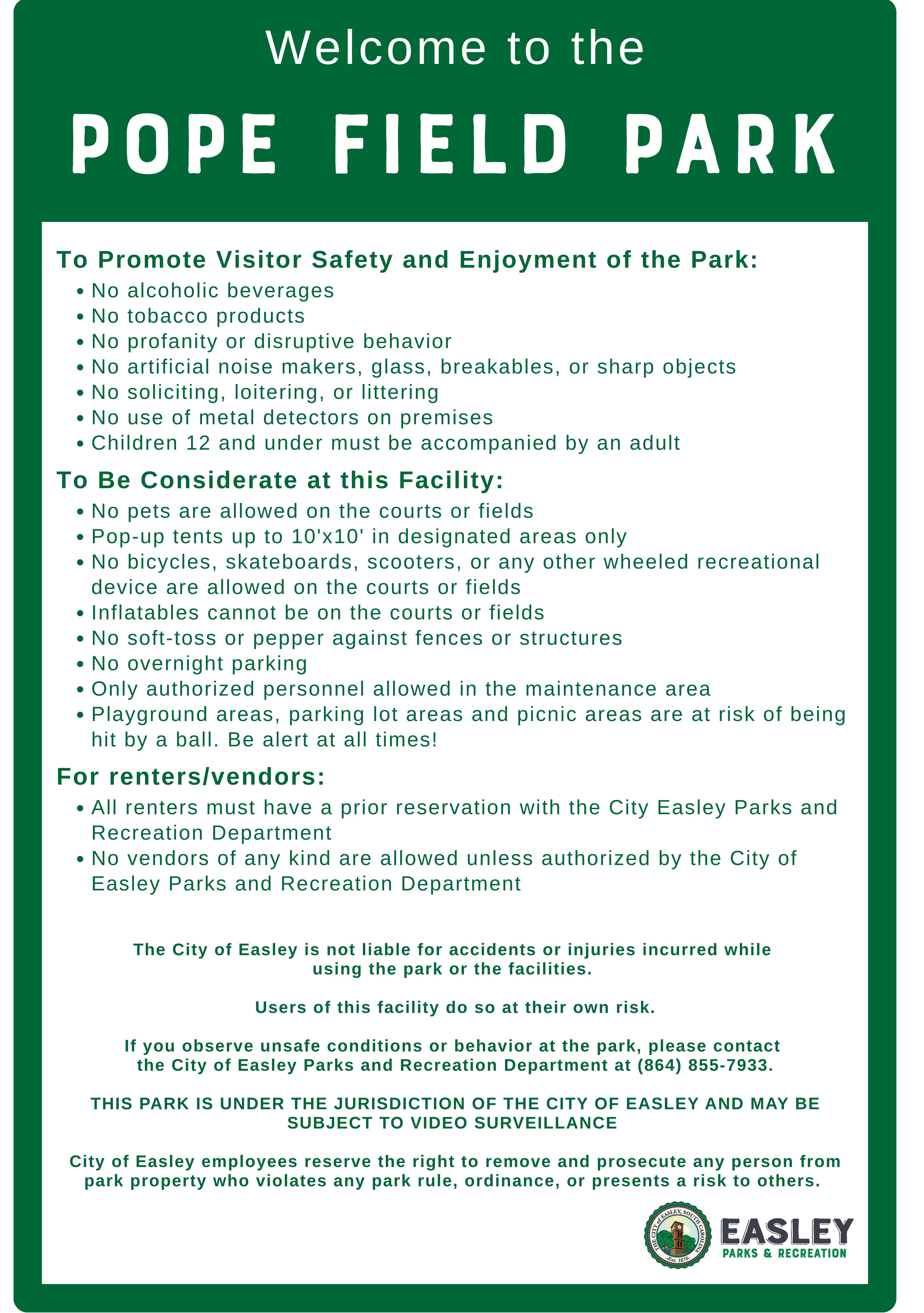 Pope Field Community Park is just seven minutes from Downtown Easley and a three minute drive from the Larry Bagwell Gymnasium.